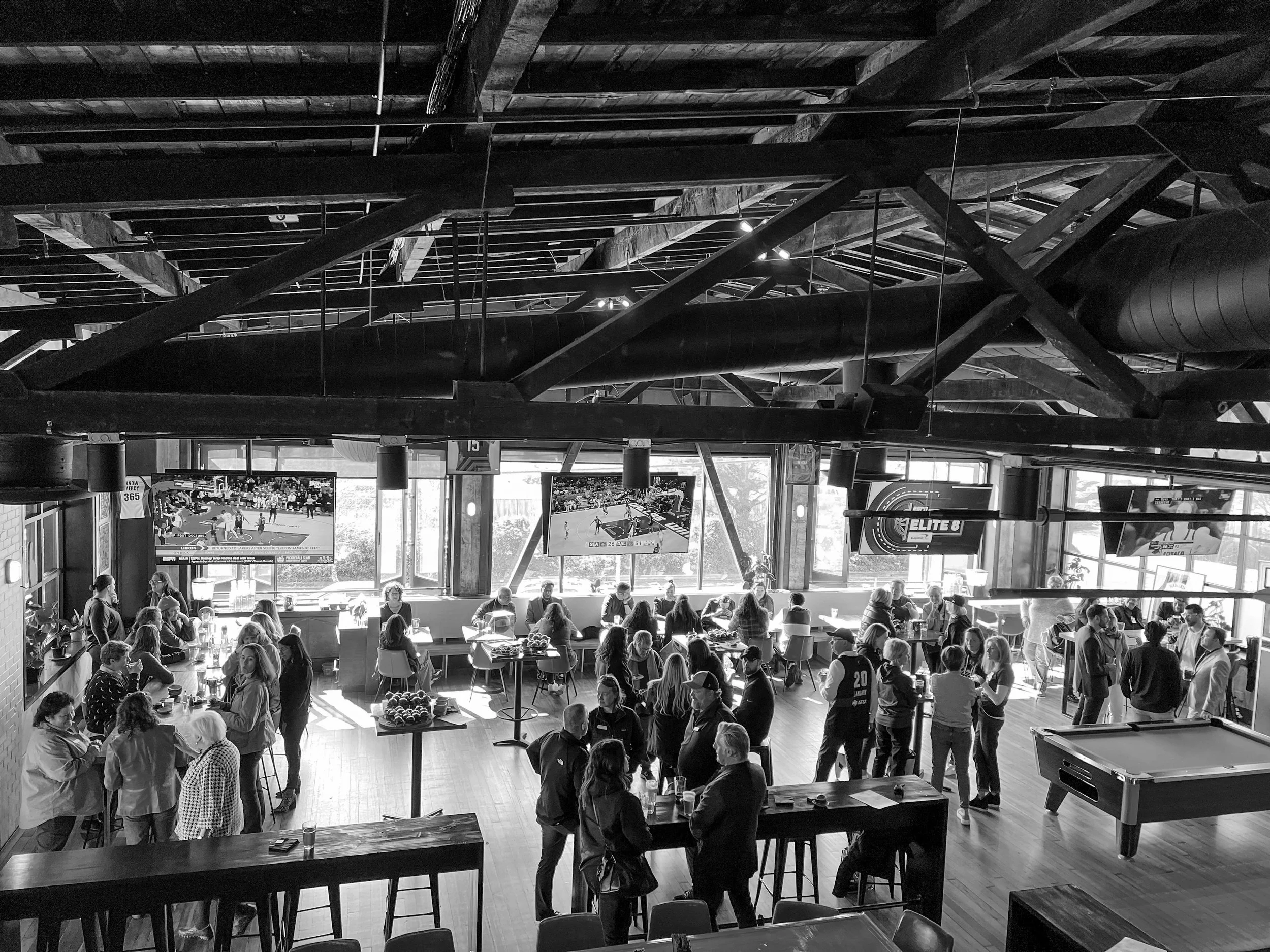 With heated floors for cooler months and rolling glass garage doors for sunny summer ones, our Banquet Room is stunning year round. Boasting two 90” screens and its own sound zone, it’s a regular home to retirement parties, wedding and baby showers, rehearsal dinners, sports team banquets, networking events, and alumni watch parties.